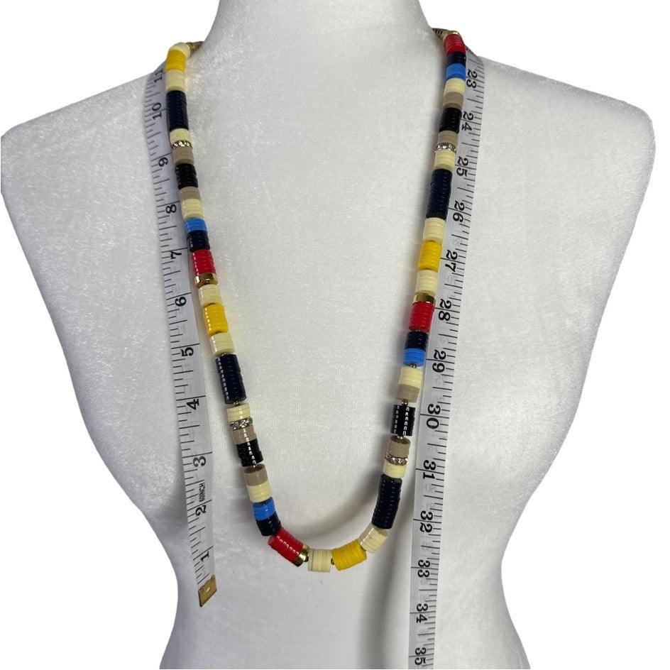 The photos don’t do this necklace justice. Multi colored spacers enhanced with sparkly rhinestones. This piece has an adjustable gold chain with the Kate Spade logo. Wear this beautiful necklace for play or professional.