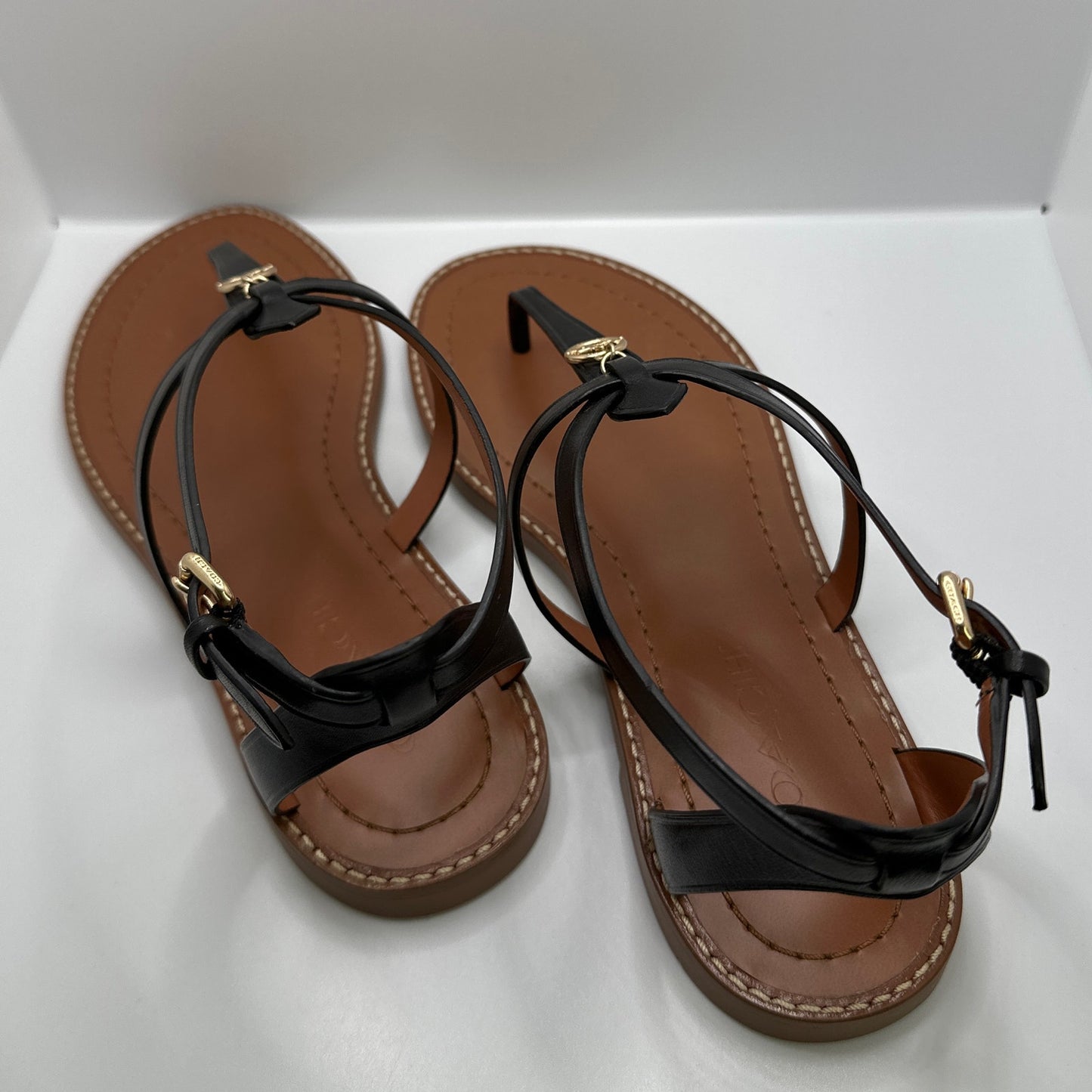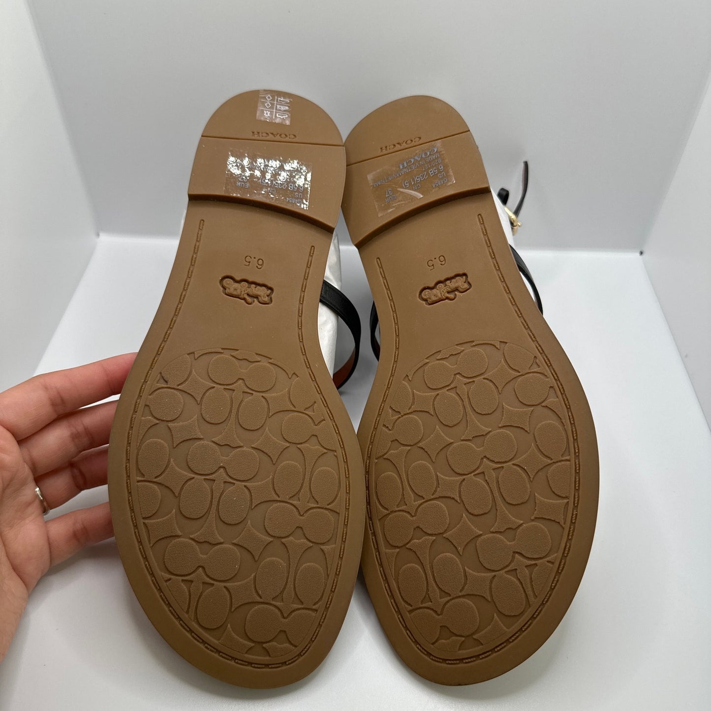 Never worn size 6.5B Coach sandals. The only wear is where the buckle attach this is because of the buckle being in place during storing.