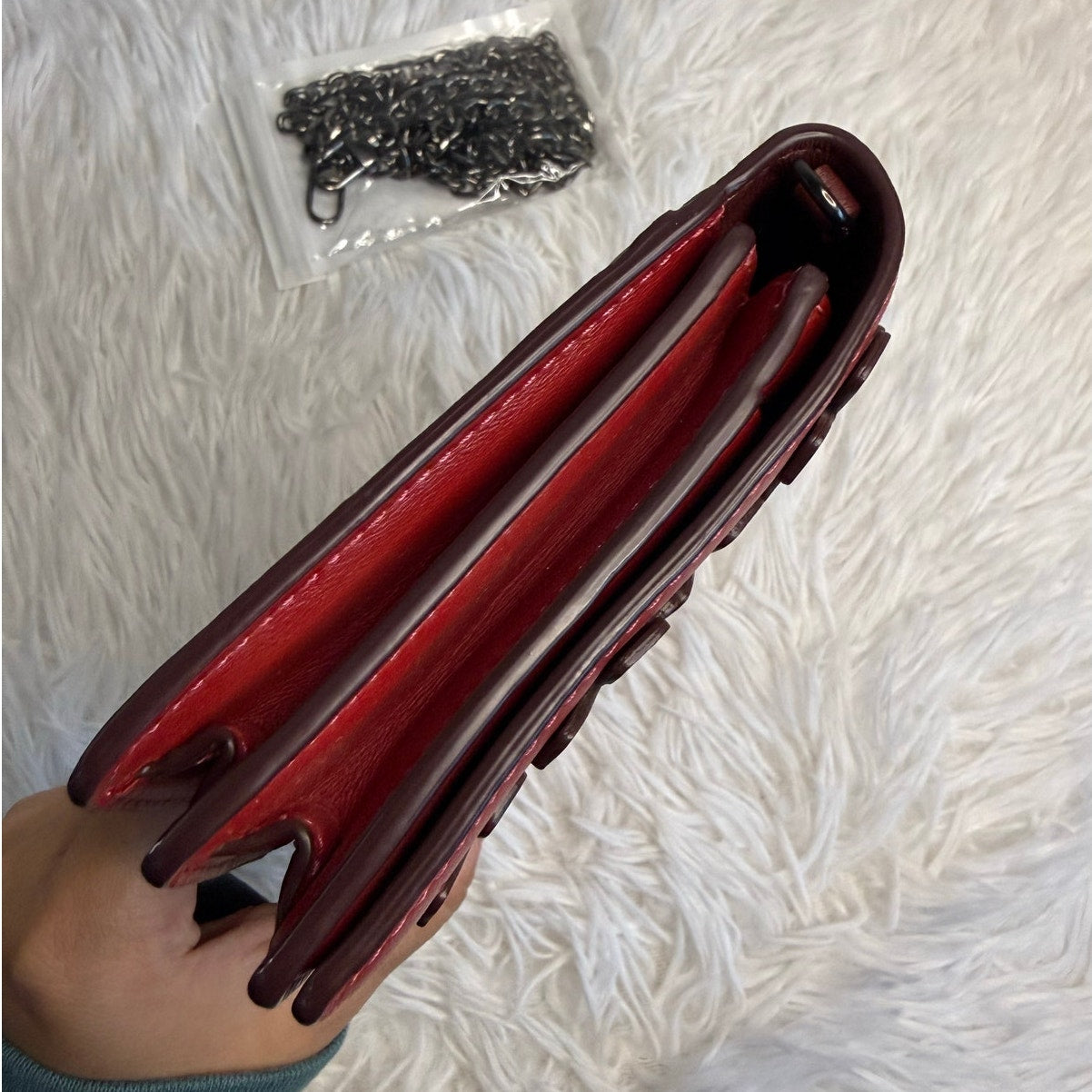 Preloved in great condition with normal wear on the exterior and interior. Please see all pictures. Little wear on the back exterior of the clutch. All shown on pictures. Chain is an unbranded chain. Did not come with clutch but was added afterwards. Will be sent with purchase.
