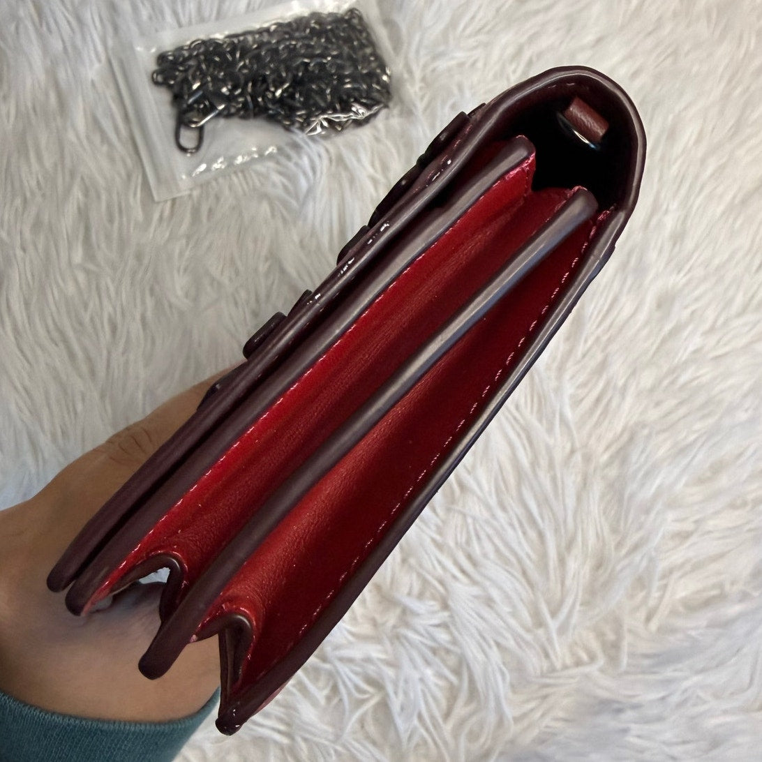 Glove tanned leather| Eight credit card slots| Full-length bill compartment| Inside zip pocket| Snap closure| Outside slip pocket| Detachable chain strap with 23" drop for shoulder or crossbody wear| Instantly change the look of your bag with an interchangeable strap.| 8" (L) x 4 3/4" (H) x 2 1/4" (W)